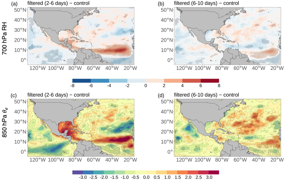 Simulated ensemble-mean June–November averaged (top) 700 hPa relative humidity (%) and (bottom) 850 hPa equivalent potential temperature (K) for (a, c) the 2–6-day filtered experiment minus the control, and (b, d) the 6–10-day filtered experiment minus the control. Hatching indicates statistically significant differences (p < 0.05).